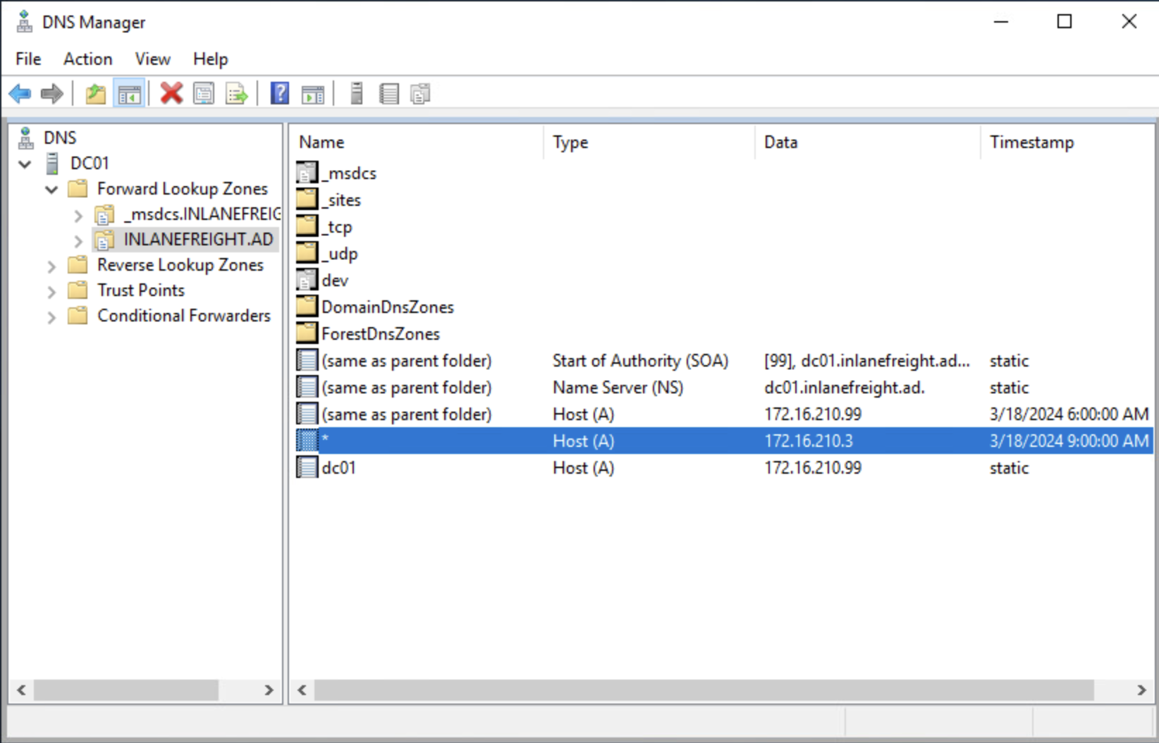 VERBOSE: [+] Distinguished Name = DC=*,DC=inlanefreight.ad,CN=MicrosoftDNS,DC=DomainDNSZones,DC=inlanefreight,DC=ad