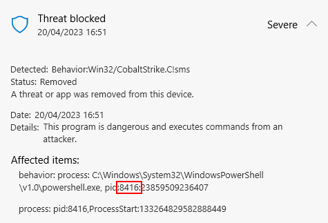 Este es el spawnto predeterminado de Cobalt Strike y casi siempre se marca como malicioso cuando se inicia desde un proceso userland. Probablemente también encuentres que Defender mata tu Beacon durante o después de la ejecución. Esto es una detección de comportamiento y no se elude con bypasses AMSI en Beacon.
