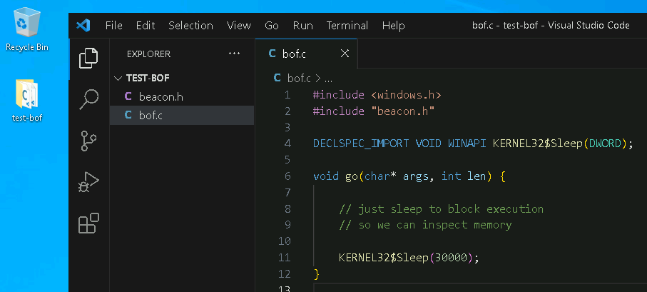 attacker@DESKTOP-3BSK7NO /m/c/U/A/D/test-bof> x86_64-w64-mingw32-gcc -c bof.c -o bof.o