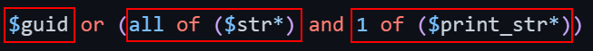 En este caso, tiene que encontrar "$guid" o, si no encuentra "$guid", necesita "$str0", "$str1", y "$str2"; además de "$print_str1", "$print_str2", o "$print_str3". Por lo tanto, la cantidad mínima de cambios necesarios para eludir la regla es eliminar "$guid" y al menos una de las variables "$str".