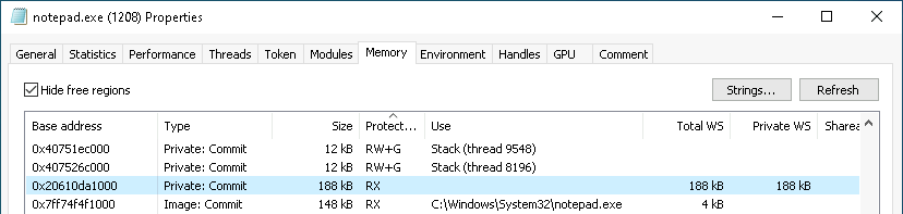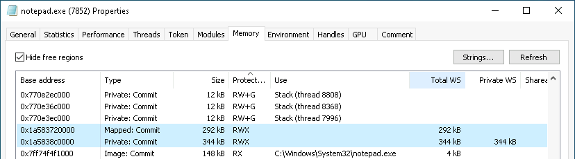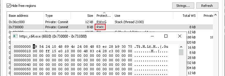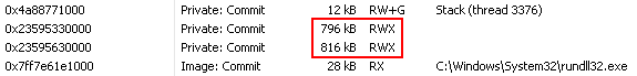 Entonces, en este caso, una región RWX es asignada por el injector y la otra RWX por el reflective loader.