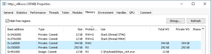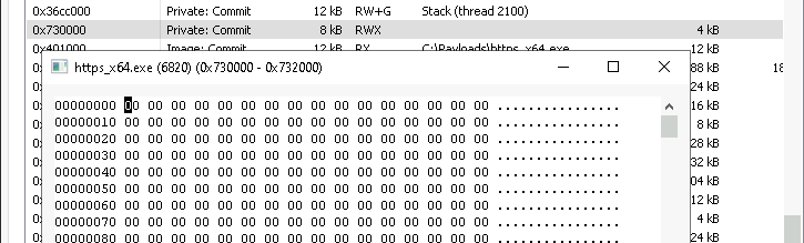 Verás asignaciones similares si generas un payload EXE normal en Cobalt Strike. Cada artifact de payload hace lo mismo, que es inyectar y ejecutar el reflective loader. La única diferencia en este ejemplo es que el EXE artifact predeterminado asigna memoria para el reflective loader como RW primero y luego cambia a RX. La asignación de memoria hecha por el reflective loader sigue siendo RWX.