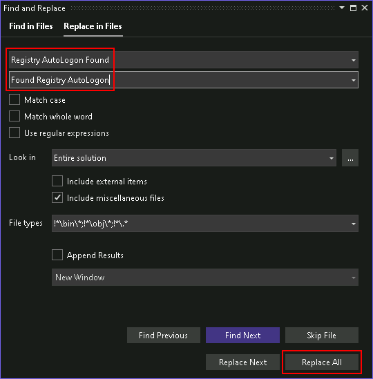 Hay algunos trucos rápidos para reemplazar todas las instancias de ciertas cadenas en Visual Studio, lo cual es útil si aparecen varias veces. Abre la ventana "Replace in Files" yendo a Edit > Find and Replace > Replace in Files o presionando Ctrl+Shift+H.