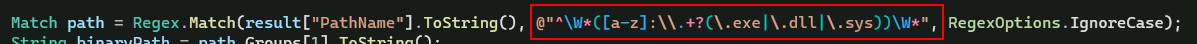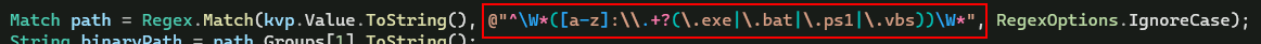 La firma YARA para esto incluye la cadena literal "{0}", utilizada en String.Format. En tiempo de ejecución, se reemplaza con el valor de sc.ServiceName. Podemos eliminar esta firma reemplazando esta llamada con string interpolation, de modo que la línea quede así: