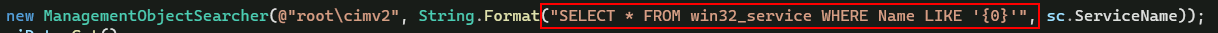 ManagementObjectSearcher wmiData = new ManagementObjectSearcher(@"root\cimv2", $"SELECT * FROM win32_service WHERE Name LIKE '{sc.ServiceName}'");