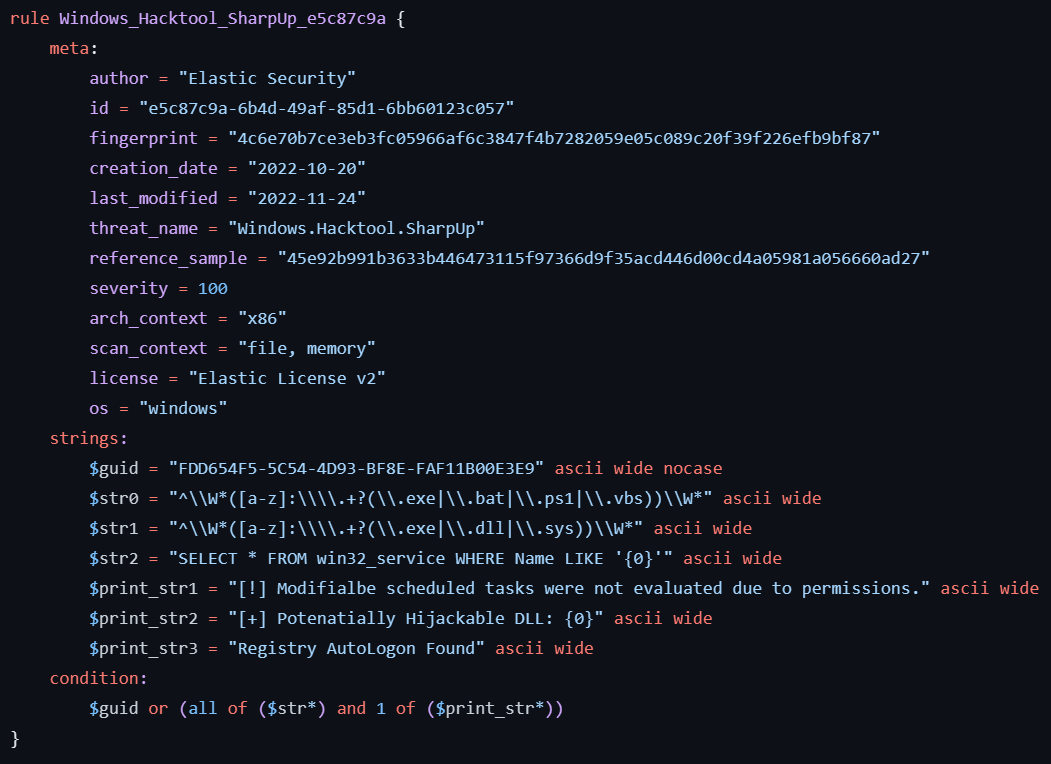 Podemos consultar reglas YARA públicas para hacernos una idea de qué firmas utilizan. Algunos de los proyectos GhostPack proporcionan un archivo de reglas YARA, como este para Rubeus. El archivo Windows_Hacktool_SharpUp.yar es el que queremos ver en este ejemplo.