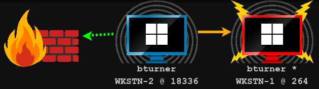 Si intentas moverte lateralmente a una máquina usando WMI, puedes emplear remote-exec en Beacon o una herramienta externa como SharpWMI para ejecutar un comando de forma remota. Sin embargo, serán bloqueados al pasar siempre por WmiPrvSE (WMI Provider Host). Por ejemplo, ejecuta un Beacon en WKSTN-2 e intenta usar WMI para ejecutar un comando remoto en WKSTN-1.