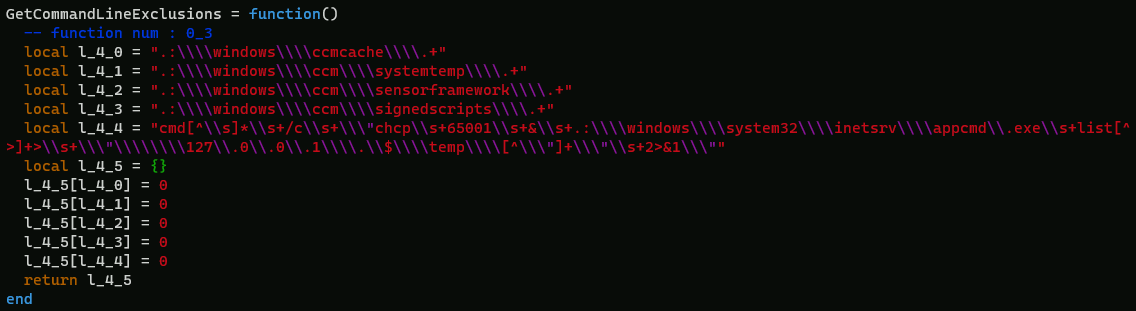 GetMonitoredLocations define todos los procesos "source" a los que se aplicará esta regla. Puesto que la regla es "all Office applications", aquí encontraremos todas las rutas de aplicaciones Office. Si bajamos un poco, veremos la parte interesante — GetPathExclusions. Estas son las rutas de aplicación excluidas de la regla ASR, o dicho de otra forma, todas las aplicaciones que Office puede engendrar como child processes.