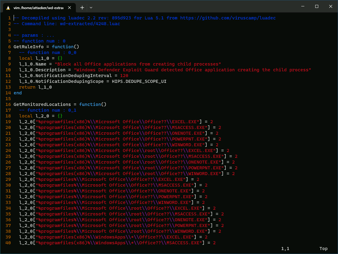 Esta investigación fue publicada originalmente por commial alrededor de 2020-2021. Descubrieron que parte de la lógica ASR está gobernada por LUA, y dieron con un proceso de varios pasos para extraer, parsear y decompilar de nuevo al formato legible para humanos desde los archivos VDM (Virus Definition Module) de Defender.