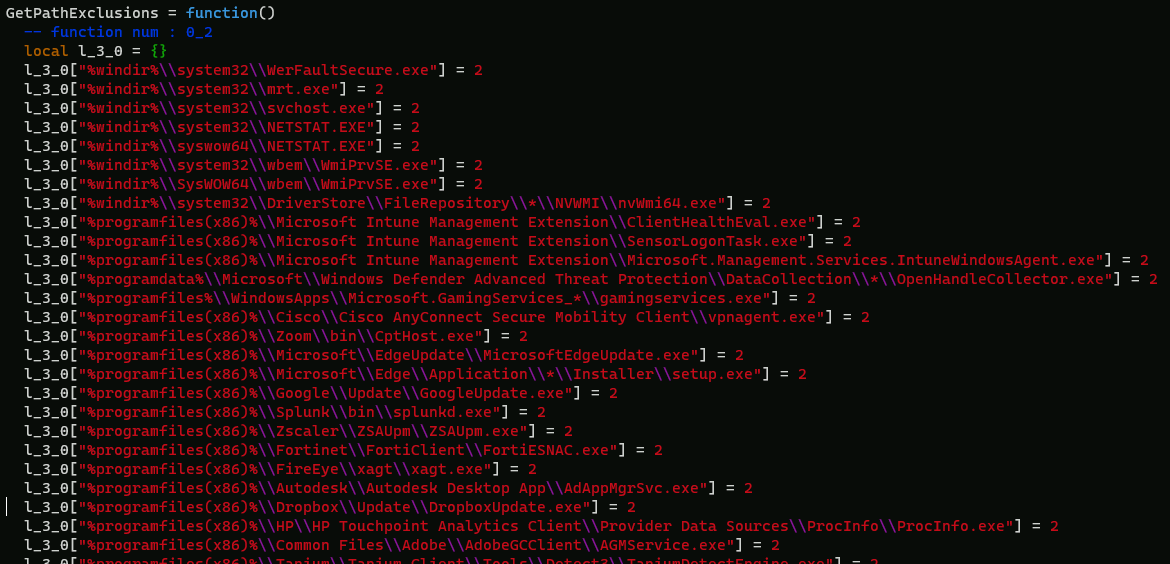 Al momento de escribir esto, hay más de 500 rutas excluidas, algunas también en ubicaciones de riesgo como %AppData%.