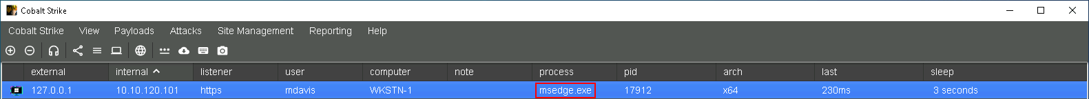 Copia el contenido de C:\Payloads\inject.vba en un macro nuevo y ejecútalo. Debería aparecer un Beacon corriendo dentro de msedge.exe.