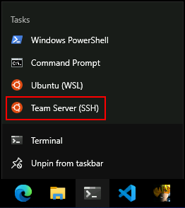 Desde la consola del Attacker Desktop, haz clic derecho en el ícono de Terminal en la barra de tareas y selecciona Team Server. Esto iniciará una conexión SSH hacia la máquina virtual Attacker Linux.