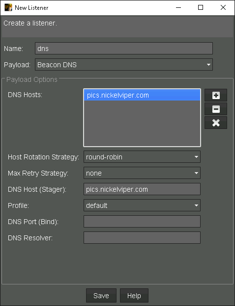 El listener DNS permite que Beacon envíe y reciba mensajes C2 a través de varios tipos de búsqueda/respuesta, incluyendo A, AAAA y TXT. Por defecto, se usan registros TXT porque pueden contener la mayor cantidad de datos. Esto requiere crear uno o más registros DNS para un dominio del cual el team server será autoritativo. En el caso de nickelviper.com, he configurado lo siguiente: