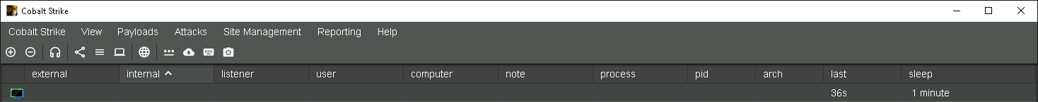 Las columnas de datos muestran los metadatos de Beacon, la mayoría de los cuales son autoexplicativos. La columna sleep muestra con qué frecuencia Beacon debería realizar el check-in con el servidor de equipo. Por defecto, es cada 60 segundos. La columna last muestra cuánto tiempo ha pasado desde el último check-in. Si Beacon pierde 3 check-ins consecutivos, el número en la columna last se mostrará en negrita/itálica para indicar que Beacon podría estar perdido.