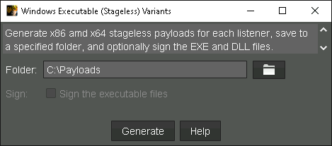 Produce un payload sin etapas precompilado como un EXE, Service EXE, DLL, shellcode, así como PowerShell. También es el único método para generar payloads para listeners P2P.