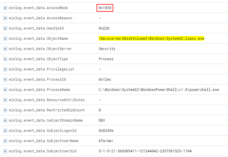 El primero ya es parte de la búsqueda guardada "Suspicious Handle to LSASS". Esta vez vemos una máscara de acceso de 0x1038. Esta es una combinación de PROCESS_QUERY_LIMITED_INFORMATION (0x1000), PROCESS_VM_WRITE (0x0020), PROCESS_VM_READ (0x0010) y PROCESS_VM_OPERATION (0x0008).