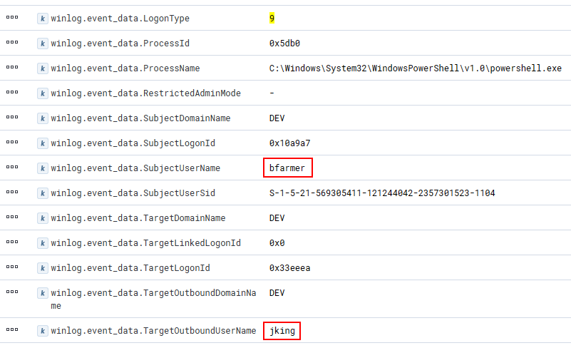 De forma predeterminada, Rubeus usará un nombre de usuario, dominio y contraseña aleatorios con CreateProcessWithLogonW, lo que aparecerá en el evento de inicio de sesión 4624 asociado. La búsqueda guardada "Suspicious Logon Events" mostrará los 4624 donde el TargetOutboundDomainName no sea un valor esperado.