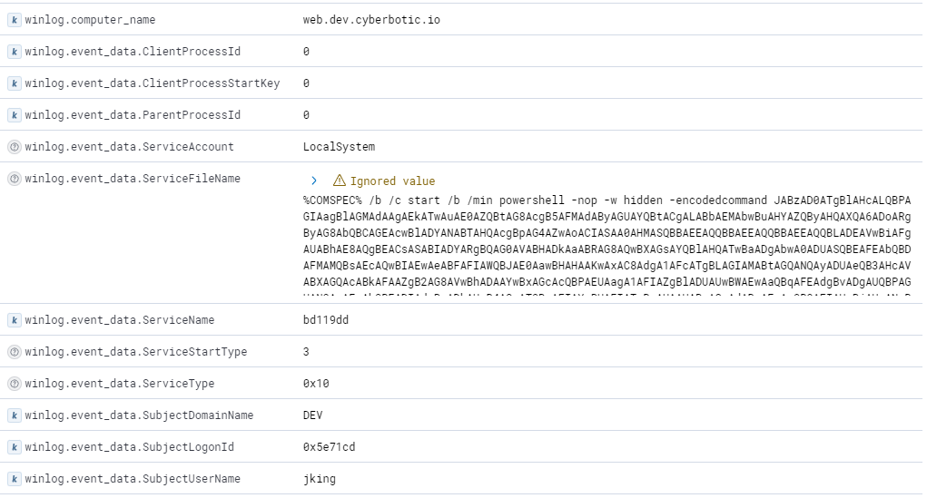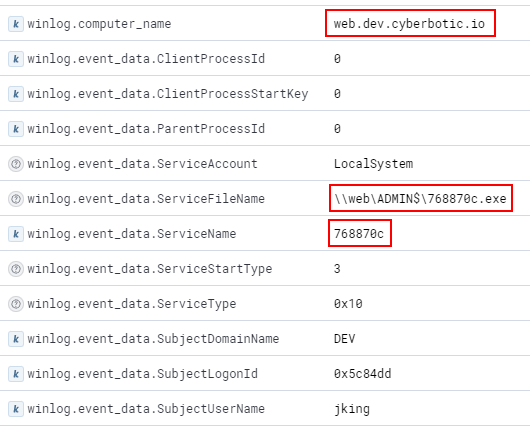 Una forma confiable de buscar PsExec es buscando eventos de servicio creado 4697. Estos eventos suelen ser bastante raros, a menos que un servicio venga con una instalación de software o algo similar. Cobalt Strike genera una cadena alfanumérica aleatoria de 7 caracteres que utiliza tanto para el nombre del servicio como para el nombre del archivo binario. Al configurar el binPath para el servicio, utiliza una ruta UNC al recurso compartido ADMIN$.