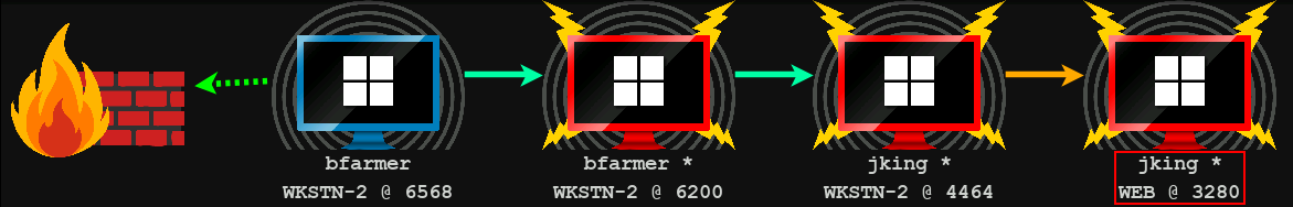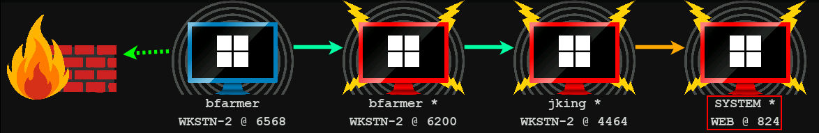 Sabemos que jking es administrador local en WEB, pero debido a que CoInitializeSecurity ya se ha llamado (probablemente en el contexto de bfarmer), WMI falla con acceso denegado. Como solución, la ejecución de WMI debe provenir de un proceso diferente. Esto se puede lograr con comandos como spawn y spawnas, o incluso execute-assembly con una herramienta como SharpWMI.