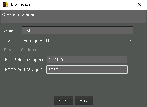 Ve a la gestión de listeners en Cobalt Strike y crea un nuevo listener Foreign HTTP. El host y puerto del stager deben coincidir con tu MSF multi handler.