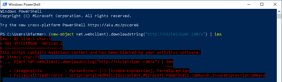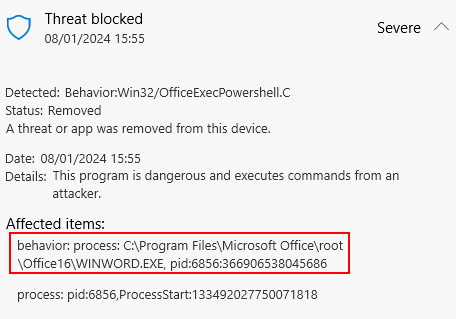 Defender hace un buen trabajo bloqueando estos casos porque que Word genere PowerShell no es un comportamiento común y es una táctica de phishing bien conocida.
