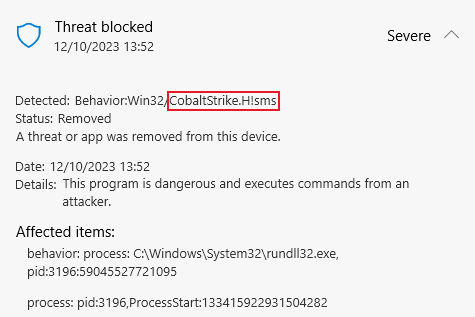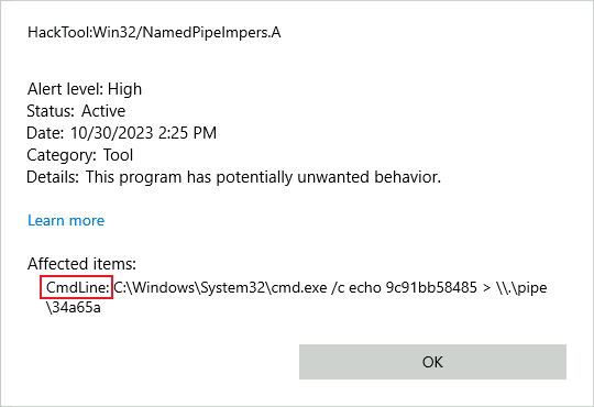 No es completamente obvio a simple vista que esto sea causado por Defender, pero puedes ver la alerta tanto en la interfaz gráfica (GUI) como a través de Get-MpThreatDetection. El prefijo "CmdLine" revela el origen de la detección. En este caso, es el patrón echo x > \\.\pipe\ ya que esto es sinónimo de suplantación de named pipe (también evidente por el título de la alerta).