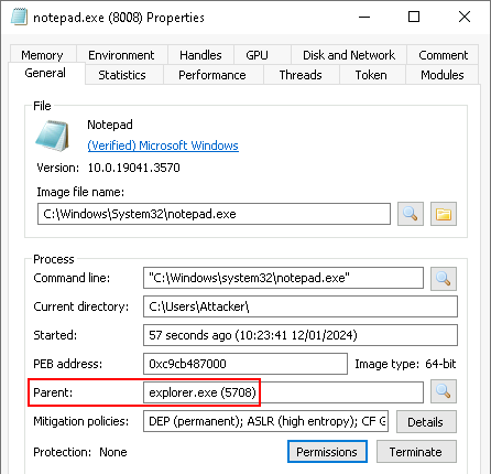 Un subconjunto de las detecciones de comportamiento provienen de las relaciones padre/hijo de los procesos en ejecución. Como regla general, el padre de un proceso es el proceso que lo inició. Por lo tanto, un proceso solo tiene un padre pero puede tener muchos hijos. Aplicaciones como Process Hacker visualizan estas relaciones por su indentación.