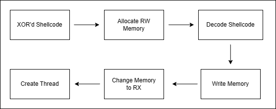 La configuración desde tu perfil de Malleable C2, como las direcciones de callback, se insertan en el DLL en el momento en que se generan las cargas útiles. Cuando generas artefactos de carga útil como los EXE's, DLL's y PowerShell, este shellcode de Beacon es generado, encriptado con XOR, y luego insertado en ellos. Los propios artefactos actúan como "inyectores" simples de shellcode. Todos ellos, con la excepción del binario de servicio, inyectan el shellcode de Beacon en sí mismos. Ese flujo se ve algo así.
