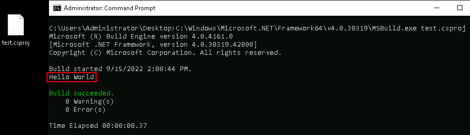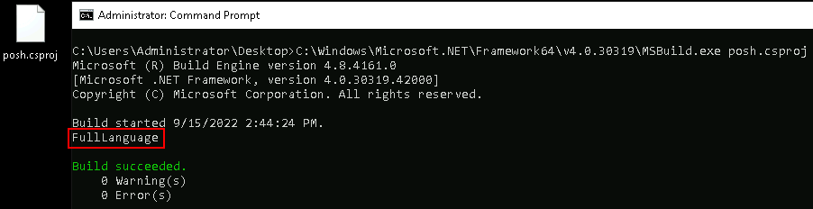 El sitio web LOLBAS contiene cientos de ejemplos que pueden utilizarse. Usemos MSBuild como demo: si no está bloqueado, puede utilizarse para ejecutar código arbitrario en C# desde un archivo .csproj o .xml.