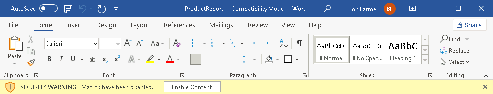 Muchas muestras de la vida real intentan atraer al usuario a hacer clic en este botón, generalmente diciendo algo como "Security Product XYZ ha escaneado el contenido y lo ha considerado seguro. Para revelar el contenido, haz clic en Enable Content".