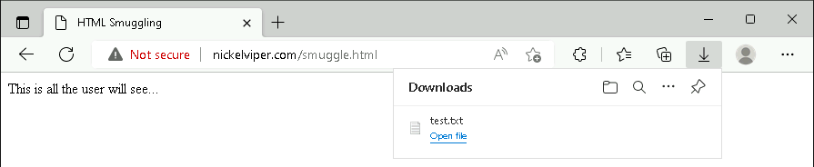 HTML smuggling es una técnica que utiliza JavaScript para ocultar archivos de los filtros de contenido. Si envías un correo de phishing con un enlace de descarga, el HTML podría verse algo así: