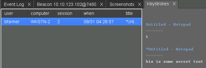 [+] received keystrokes from *Untitled - Notepad by bfarmer