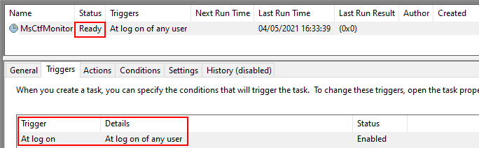Si vemos la tarea MsCtfMonitor en el Task Scheduler, podemos observar que se activa cuando cualquier usuario inicia sesión. Esto actuaría como una persistencia efectiva tras reinicios.
