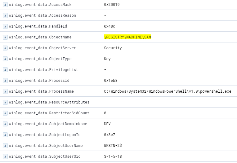 Este módulo abrirá un manejador al hive del registro SAM. Utiliza la búsqueda guardada "Suspicious SAM Hive Handle" en Kibana para verlos.