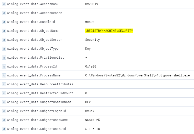 Este módulo abrirá un manejador al hive del registro SECURITY. Utiliza la búsqueda guardada "Suspicious SECURITY Hive Handle" en Kibana para verlos.