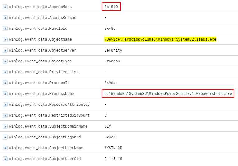 Esto muestra al usuario WKSTN-2$ (lo que significa SYSTEM en WKSTN-2) obteniendo un identificador hacia LSASS desde powershell.exe con una máscara de acceso de 0x1010. Esto proviene de los flags PROCESS_QUERY_LIMITED_INFORMATION (0x1000) y PROCESS_VM_READ (0x0010), lo cual es consistente con el código fuente de Mimikatz.